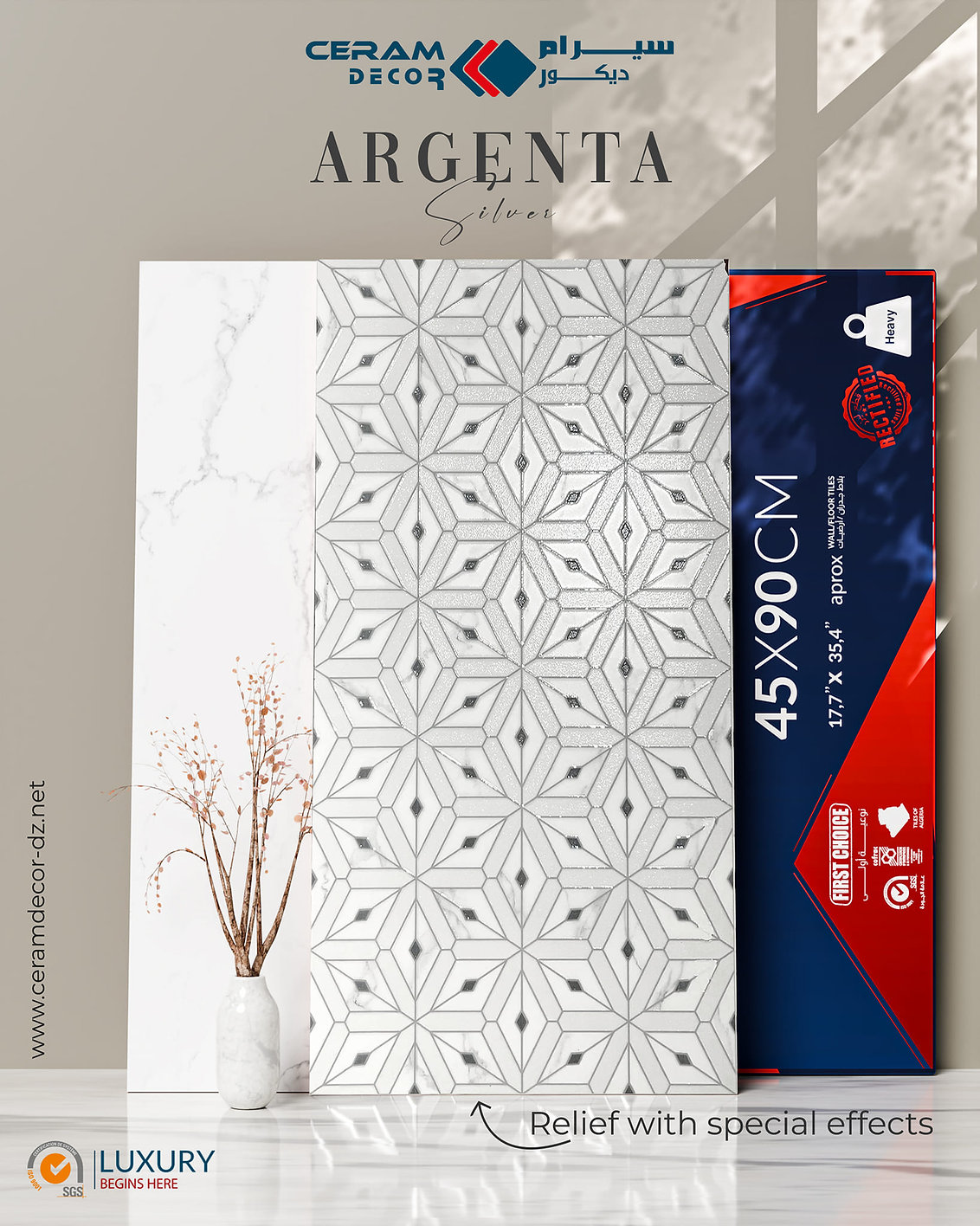 Argenta Silver Ceramic Wall Tile by CERAM DECOR is a 45x90 cm rectified wall tile designed to bring elegance and sophistication to interior spaces. Its silver-toned appearance is enhanced by special effects and detailed relief textures that add depth and visual character to the surface. The rectified laser-cut edges support a cleaner and more seamless installation result, making it suitable for refined wall applications in both modern and classic interiors. This product combines decorative impact with practical ceramic durability for stylish interior wall projects.