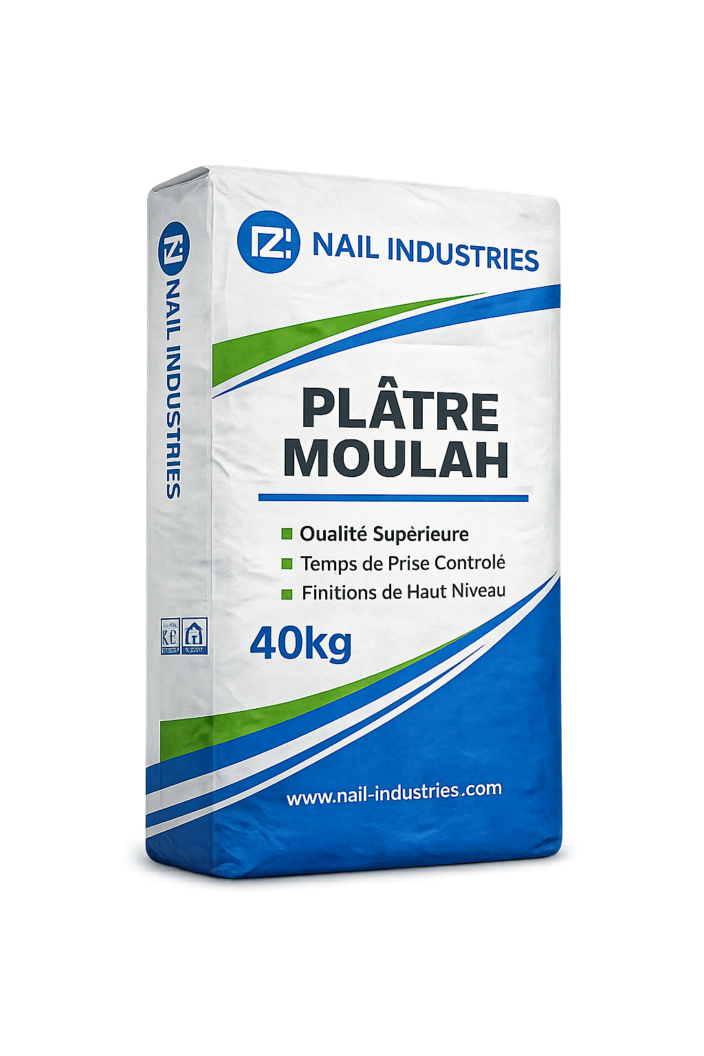 MOULAH Plaster is a gypsum-based construction product manufactured by Nail Industries in Algeria. According to the brochure, Nail Industries operates a gypsum extraction and production unit in Moullah Dar Boudjema, Djelfa, with modern European equipment and a high-purity gypsum reserve. The company indicates that it owns important gypsum reserves intended to supply plaster or gypsum for cement plants and related building uses. The visible product bag in the brochure is presented as PLÂTRE MOULAH 40 kg.