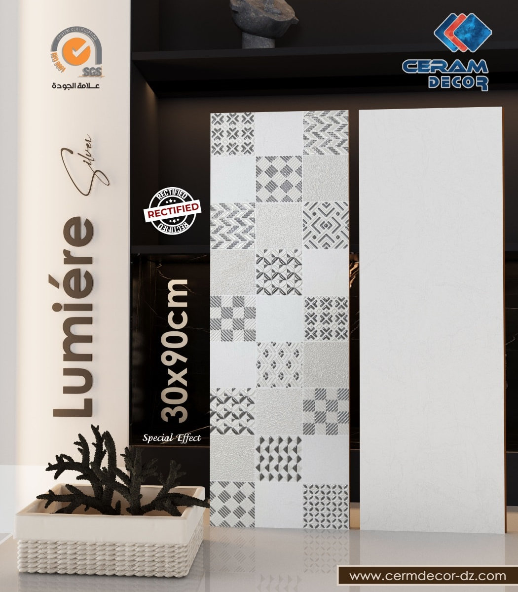Lumiere Silver Ceramic Floor Tile by CERAM DECOR is a 30x90 cm ceramic floor tile designed to bring elegance and sophistication to interior spaces. Its special effect surface creates a subtle shimmering appearance that adds a refined decorative touch, while the light grey tone supports a modern and timeless interior style. With rectified laser-cut edges and a rectangular format, this model is designed for a cleaner and more seamless installation result. It is presented as a suitable choice for kitchens, bathrooms, and living areas that need a sleek, polished ceramic finish.
