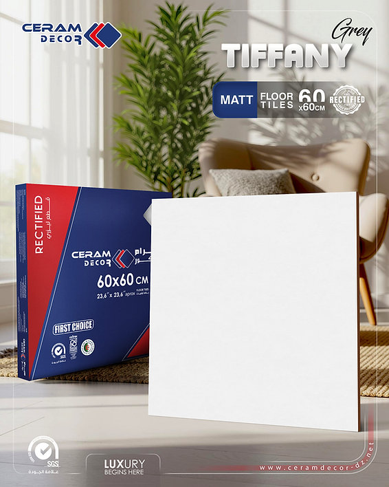 Tiffany Ceramic Floor Tile by CERAM DECOR is a 60x60 cm ceramic floor tile designed for modern interior flooring applications. Its matt finish gives the surface a soft and elegant appearance, while the rectified laser-cut edges support a cleaner and more seamless installation result. This format is suitable for residential and commercial interiors that need a refined ceramic flooring solution with a contemporary look and practical everyday performance. The product page clearly confirms the size, matt finish, rectified cutting technology, and floor-tile usage.