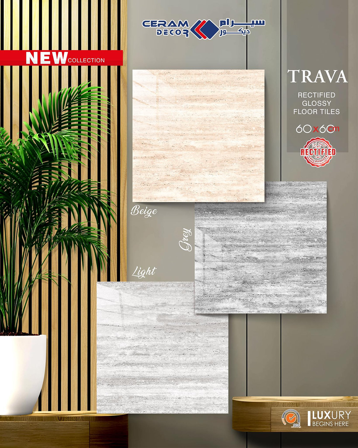 Trava Ceramic Floor Tile by CERAM DECOR is a 60x60cm ceramic floor tile designed to combine sophistication, durability, and modern style. Its glossy finish gives the surface a sleek and polished appearance, while the rectified laser-cut edges support a cleaner and more seamless installation result. The product is presented by the brand as suitable for both residential and commercial spaces, making it a versatile flooring choice for interiors that need elegance, resilience, and a refined ceramic finish.
