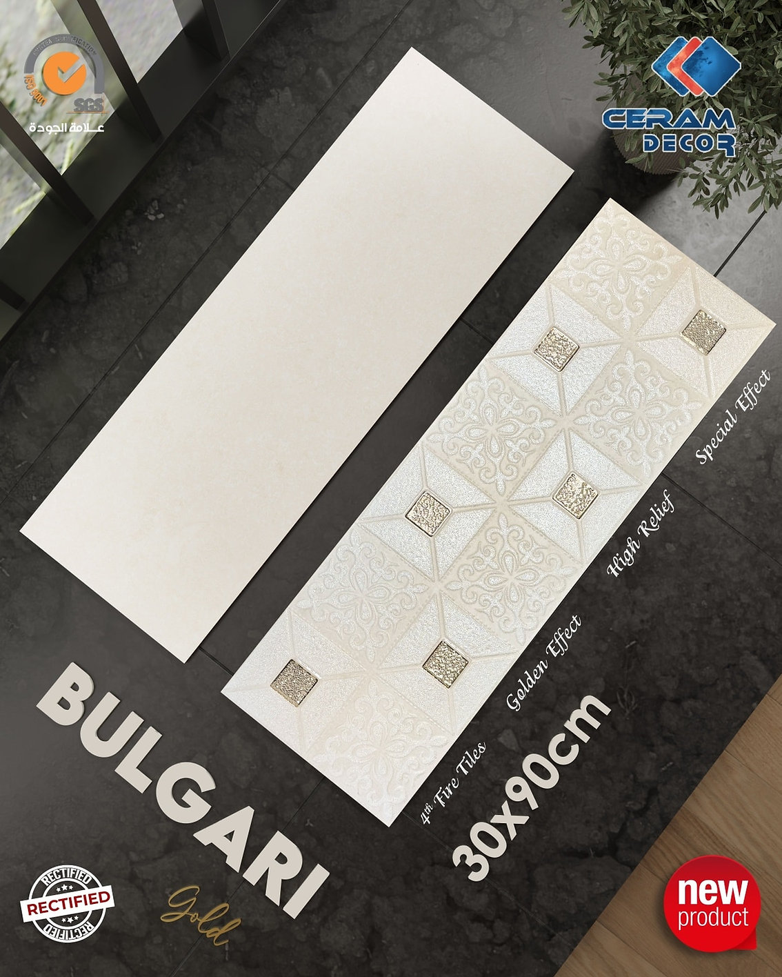 Bulgari Gold Ceramic Wall Tile by CERAM DECOR is a 30x90 cm premium wall tile designed to elevate interior spaces with a luxurious gold-inspired look. The product combines the elegance of a gold effect surface with rectified laser-cut edges for a cleaner and more seamless installation result. Presented by the manufacturer as a sophisticated solution for home and office interiors, Bulgari is positioned as a decorative wall tile that brings refinement, visual impact, and premium styling to modern spaces.
