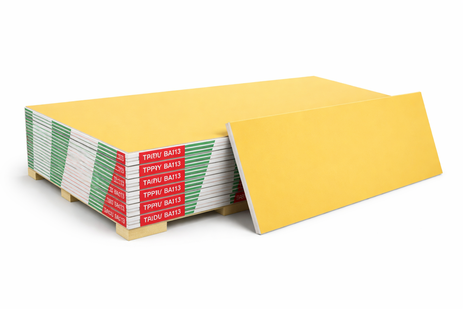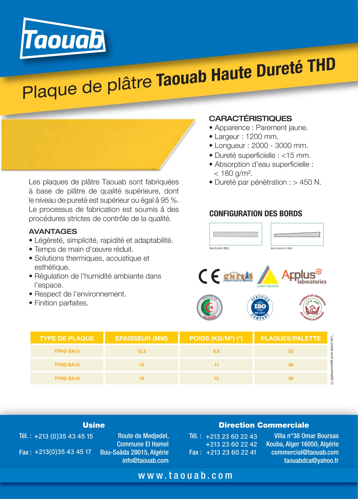 Taouab TPHD High Hardness Plasterboard is a high-impact resistant gypsum board specially developed for areas that require strong surface hardness and enhanced acoustic performance, such as schools, hospitals, sports halls, and large public facilities. It is suitable for drywall systems, wall linings, suspended ceilings, prefabricated elements, and both new construction and renovation projects. The board is manufactured from high-quality gypsum with a purity level equal to or greater than 95%, under strict quality control procedures to ensure durability and reliable performance. Applications • Drywall partitions • Wall linings • Suspended ceilings • Prefabricated construction elements • New building projects • Renovation projects • Large-scale facilities • Educational buildings • Hospitals • Sports halls Advantages • Lightweight • Easy and fast installation • Adaptable to different dry construction systems • Reduced labour time • Thermal, acoustic, and aesthetic performance • Helps regulate indoor humidity • Environmentally friendly • Smooth finished surface Technical Specifications • Appearance: Yellow cladding • Width: 1200 mm • Length: 2000 to 3000 mm • Surface Hardness: < 15 mm • Surface Water Absorption: < 180 g/m² • Penetration Hardness: < 450 N Edge Configuration • Straight Edge (SE) • Thinned Edge (TE) Available Variants • TPHD BA13 — 12.5 mm — 8.8 kg/m² — 52 boards per pallet • TPHD BA15 — 15 mm — 11 kg/m² — 46 boards per pallet • TPHD BA18 — 18 mm — 15 kg/m² — 38 boards per pallet