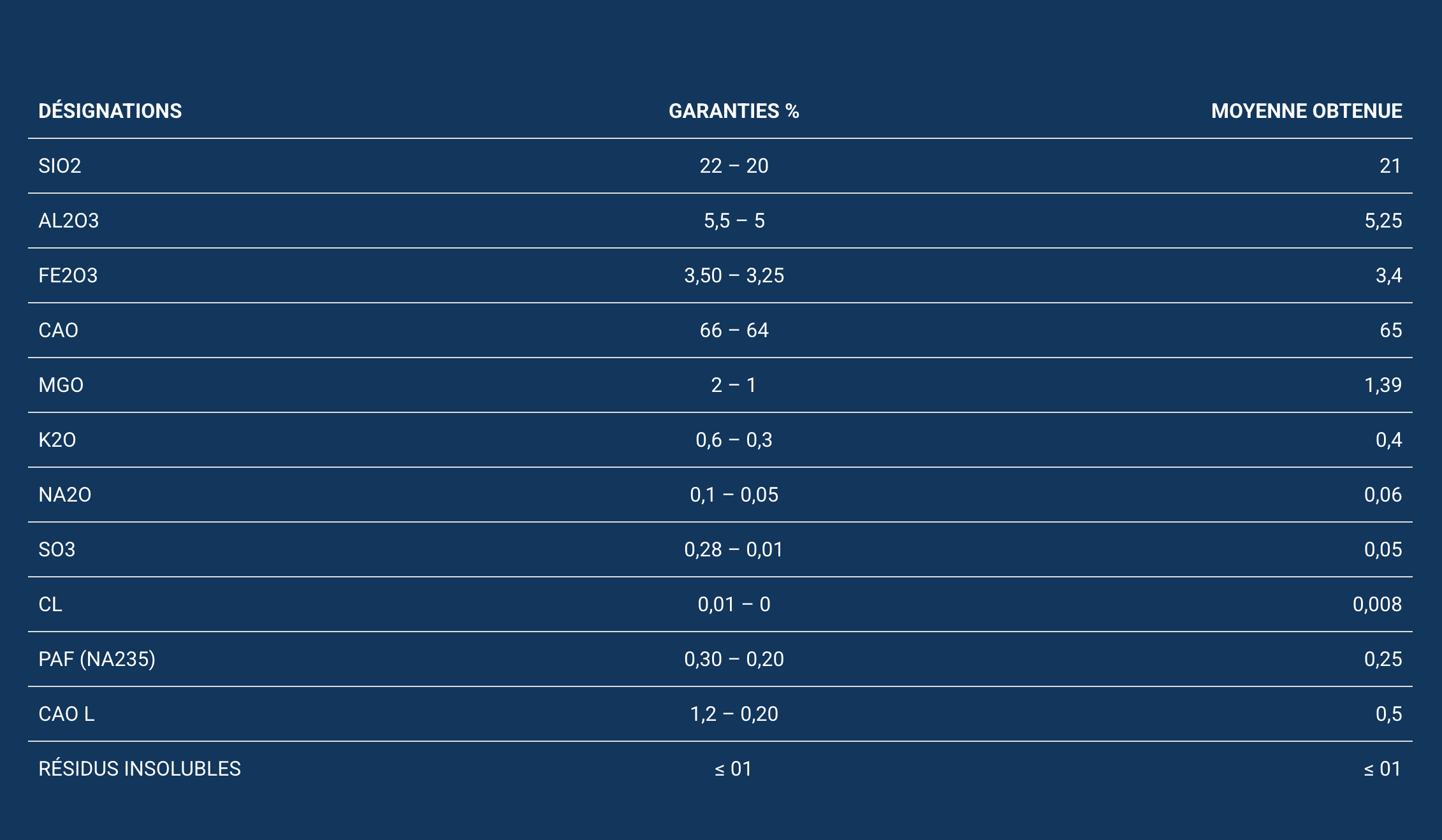 GICA Clinker is an industrial cement clinker product presented by Groupe Industriel des Ciments d'Algérie. The official product page lists chemical characteristics, mineralogical composition, modules, and physical properties, showing that the product is positioned as a technical raw material for cement manufacturing rather than a finished retail cement bag. The page also links to a technical sheet and references standard NA 442. • Chemical composition values are listed for elements such as SiO₂, Al₂O₃, Fe₂O₃, CaO, MgO, SO₃, K₂O, Na₂O, Cl, CaO L, and PAF. • Mineralogical composition is listed with values for C3S, C2S, C3A, and C4AF. • Modules shown include LSF, MS, and MA. • Physical properties include flexural and compressive strength values at 2, 7, and 28 days. • The page also provides a technical sheet link