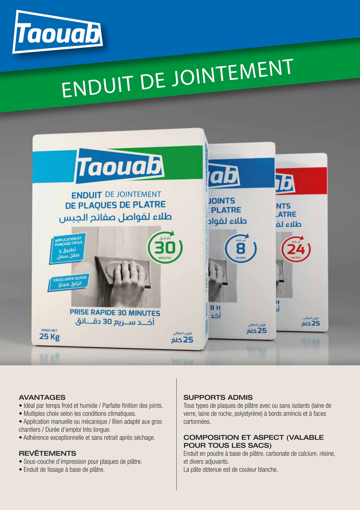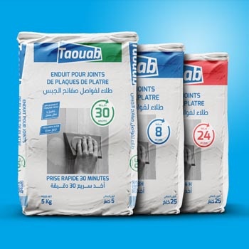 Taouab Enduit de Jointement is a powder jointing compound specially formulated for the treatment of gypsum board joints. It is designed for use with paper joint tape on tapered-edge plasterboards and is available in multiple working-time versions to suit different site conditions and application needs. The product is suitable for manual or mechanical application, offers excellent slip and smooth finishing performance, and is positioned for both standard projects and large-scale jobs.