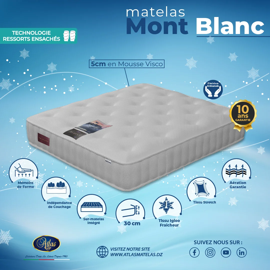 This top-of-the-range mattress of 30 cm height is supported by pocket springs, structure with double superimposed carcass of: 13 and 7cm which guarantee excellent sleeping independence and an integrated 5 cm mattress topper in memory foam memory, bringing you soft comfort. Its cooling fabric ensures permanent regulation of the body's temperature to cope with heat stroke. The quality of this mattress is reflected both in its filling and in the care taken in its particular handcrafted finish. Thanks to the pocket spring technology, ventilation is optimal and thus the service life is extended. FEATURES: Height: 30 cm Pocket springs → structure with double superimposed carcass of: 13cm (flexibility +) / 7cm (flexibility +++) Sleeping independence Features a built-in 5 cm memory foam mattress topper Igloo fabric (guaranteed freshness) Stretch knit fabric Virgin Fiber Guaranteed ventilation Handcrafted Finishing One Sleeping Face 10-year warranty