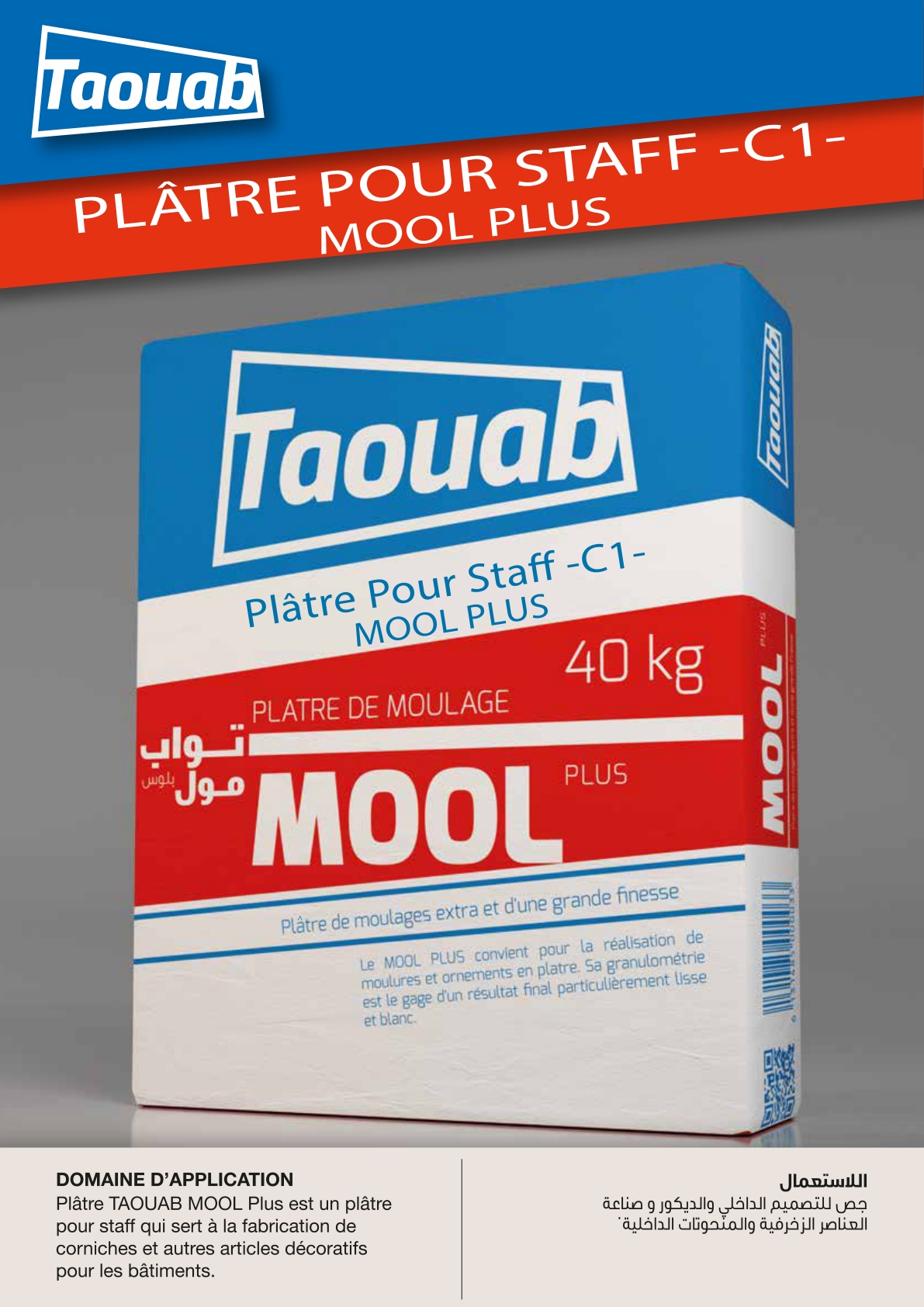 Taouab MOOL PLUS C1 is a plaster for staff work designed for moulding, decorative plaster elements, and fine interior casting applications. The product is presented as a fine plaster suitable for staff production and interior decorative uses where a smooth and controlled plaster mix is required. The technical sheet identifies it as "Plâtre pour staff - C1 - MOOL PLUS", which positions it as a construction plaster for ornamental and prefabricated interior plaster work.
