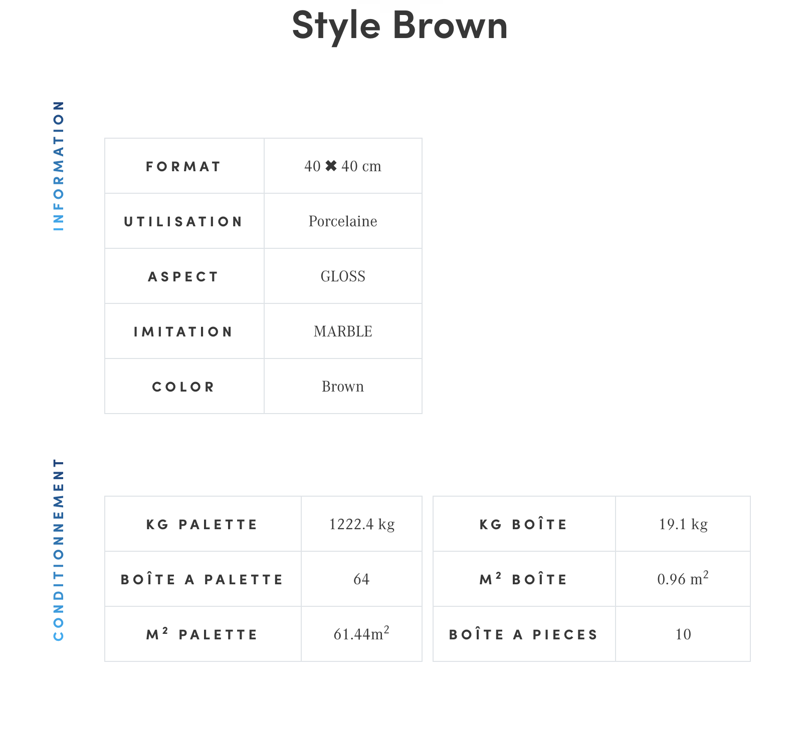 Style is a porcelain tile from InnovaCeram with a gloss surface and a marble imitation design. The official product page presents it in 40 × 40 cm format and shows two color options: Brown and Beige. It is positioned as a porcelain model suitable for ceramic flooring and similar interior finishing applications.