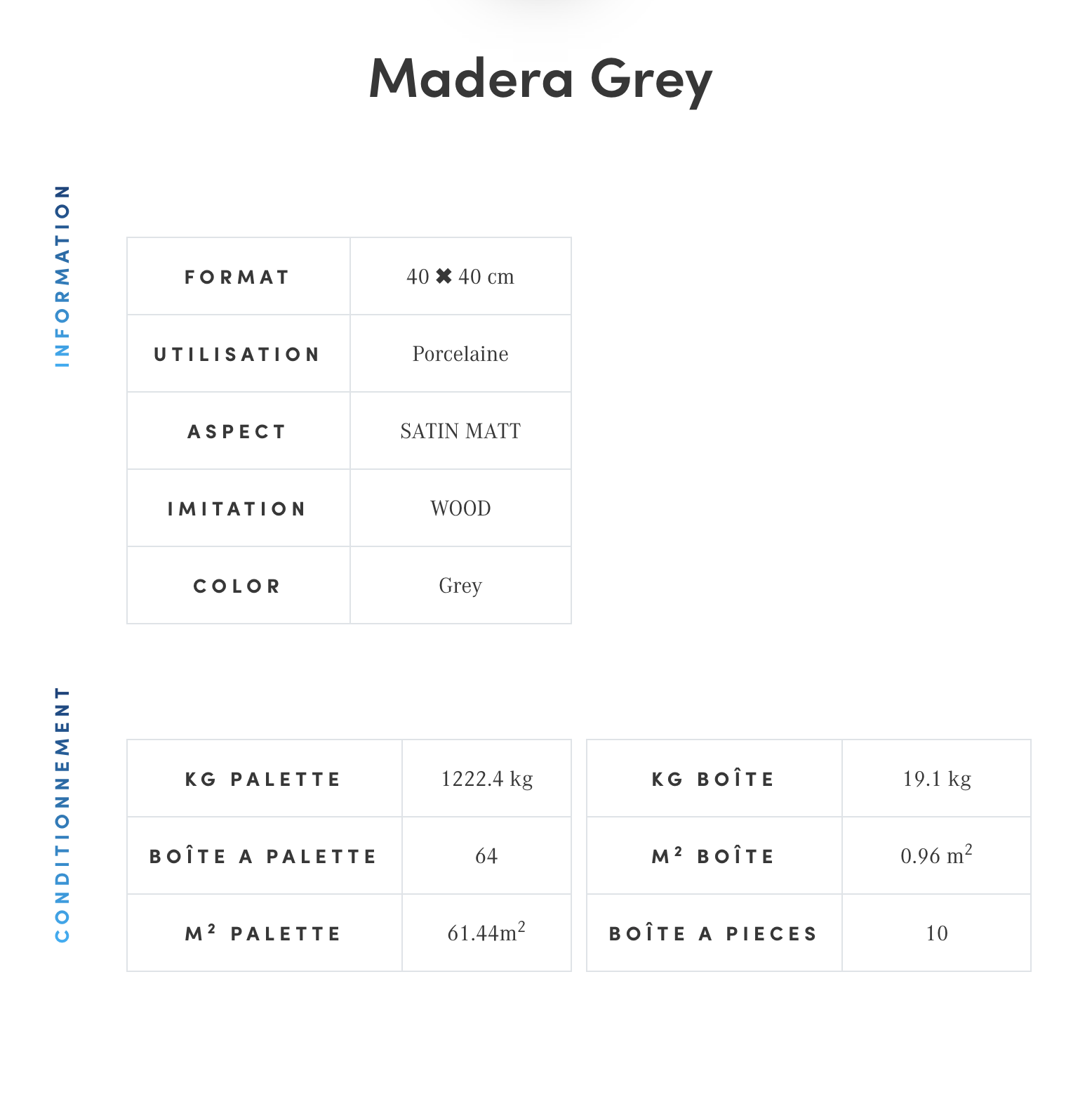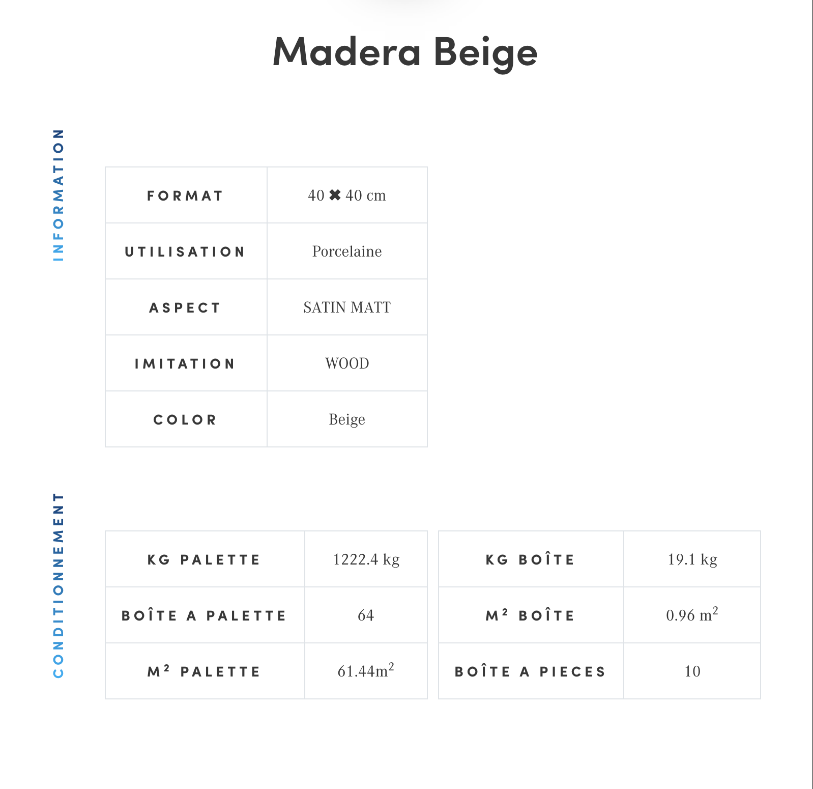 For both Madera Gris and Madera Beige, the page lists: